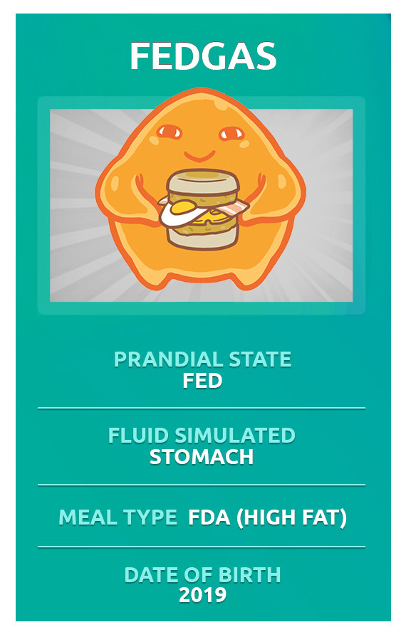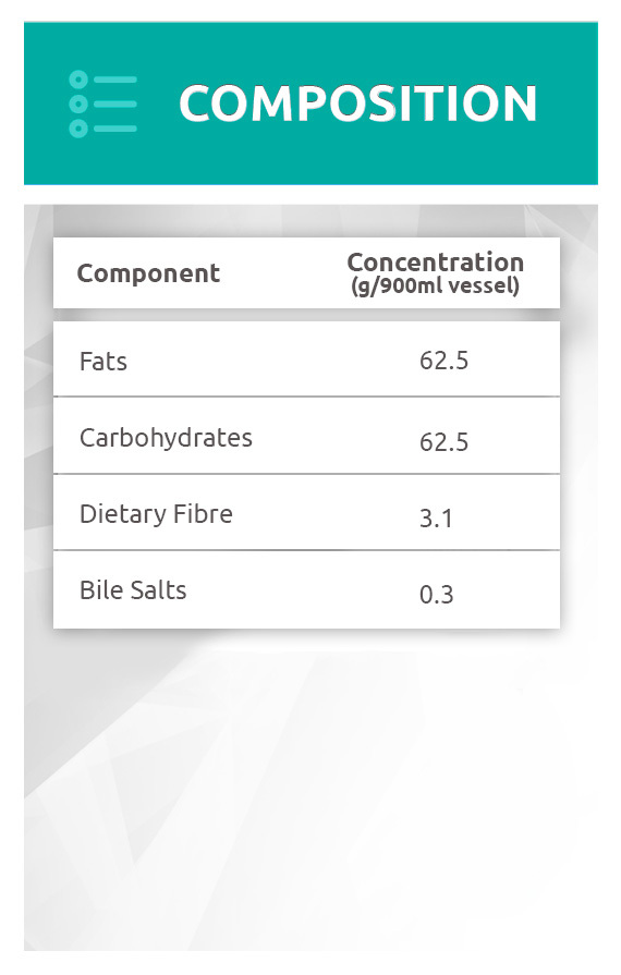 FEDGAS in vitro test solutions simulate stomach fluids after consumption of a high-fat FDA meal. The FDA meal is frequently co-administered with drugs in human clinical trials to assess potential food effects on a drug’s pharmacokinetics by eliciting an extreme physiological response in the gut. 900mL of FEDGAS medium contains the same amount of fat present in this meal. The three different types of FEDGAS (early, mid and late) represent fluids from different stages of stomach emptying (pH 3, pH 4.5 and pH 6 respectively). FEDGAS also replicates the dietary fibre and carbohydrate content of the FDA meal. Bile salt that is refluxed back into the stomach from the upper section of the small intestine during digestion is mimicked too.