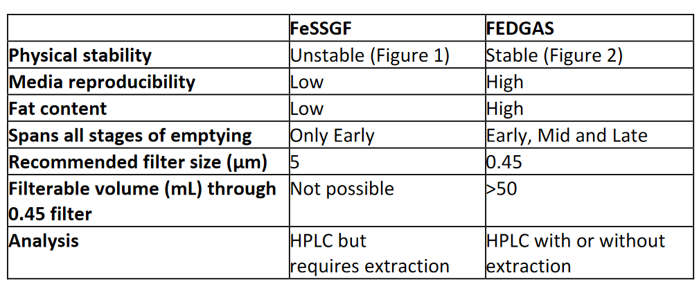 FeSSGF (Fed State Simulated Gastric Fluid) is based on milk and has been proposed for dissolution testing but has distinct limitations for laboratory use. FEDGAS (Fed Gastric) media was developed by Biorelevant to overcome the limitations of FeSSGF as this comparison table of their respective properties demonstrates: