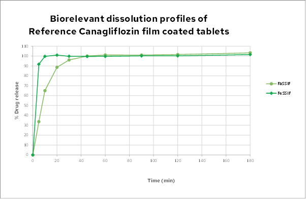 Dissolution profiles of the Reference determined using our Biorelevant Dissolution Guide. To enable a back-to-back comparison with BCS data both sets of dissolution tests (BCS and biorelevant) used the same parameters (n=6, 75rpm, 900 mL volume and 37°C). HPLC was used for analysis of canagliflozin as HPLC should be used for biorelevant drug analysis. An HPLC method was successfully developed for selectivity, linearity, precision, and accuracy. Samples were found to be stable for the duration of the analysis. The dissolution method was also found to be accurate and precise using a USP 2 apparatus.