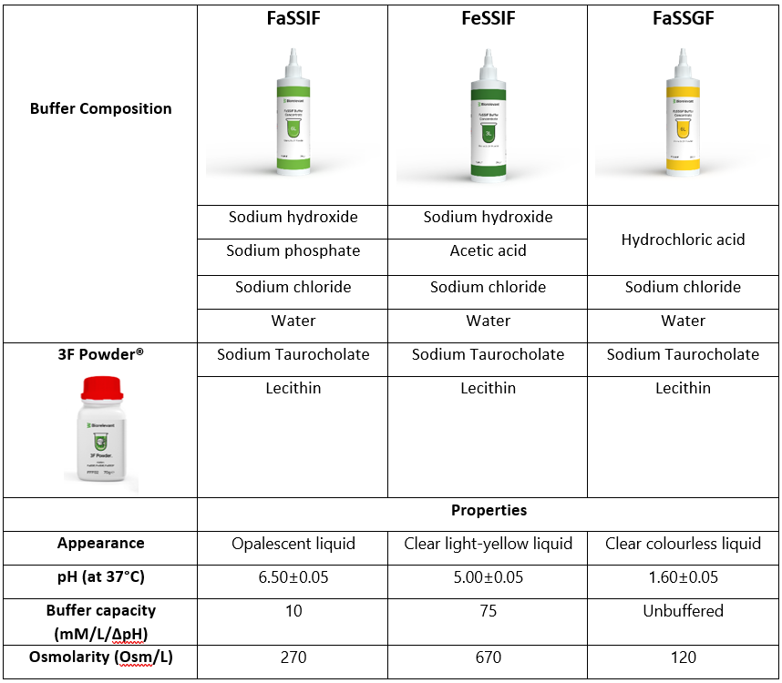 Each of the three FaSSIF, FeSSIF and FaSSGF Buffer Concentrates contain the precise amounts of components to achieve the appropriate buffer capacity, osmolarity and pH of the original FaSSIF, FeSSIF and FaSSGF biorelevant media.