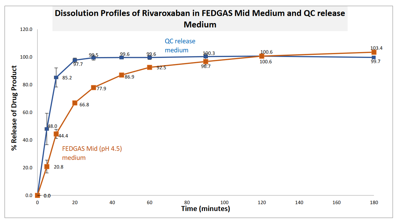 Dissolution profiles of Reference rivaroxaban 20 mg film-coated tablets were established in FEDGAS Mid (pH 4.5) and QC release Acetate buffer pH4.5 + 0.4% sodium dodecyl sulphate (SDS) medium.