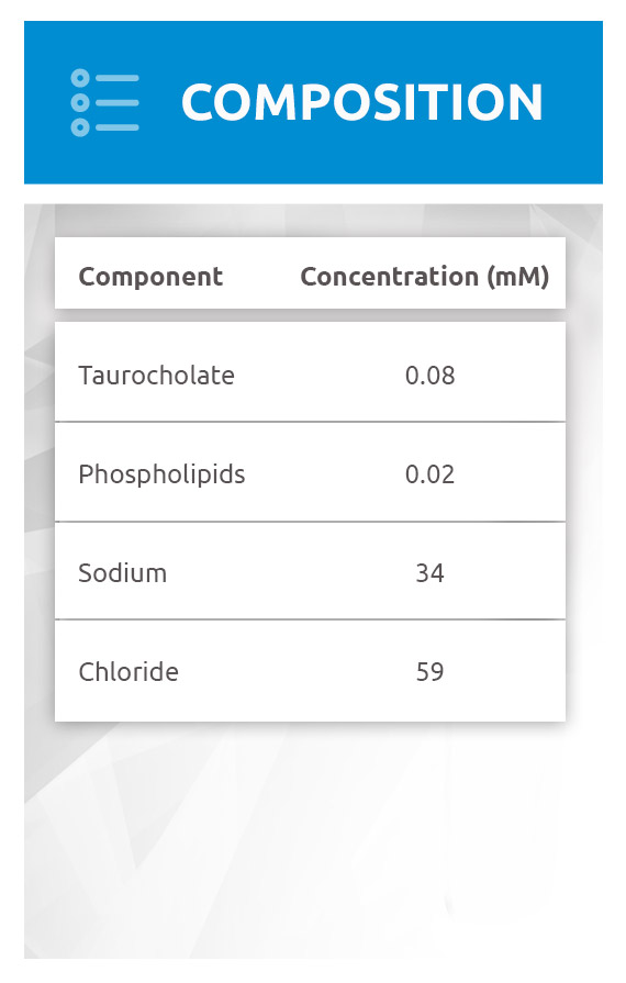 In vivo gastric fluid in the fasted state contains low levels of surfactants refluxed back into the stomach from the upper section of the small intestine. FaSSGF contains the same type and low level of these surfactants (bile salt and phospholipid). These components can contribute to the wetting of a dosage form and drug. FaSSGF has the average acidic pH of fasted gastric fluid and similar osmolarity (about 120 mOsmol/L) too. These are important parameters to control when testing drugs or formulations sensitive to pH and salt content.