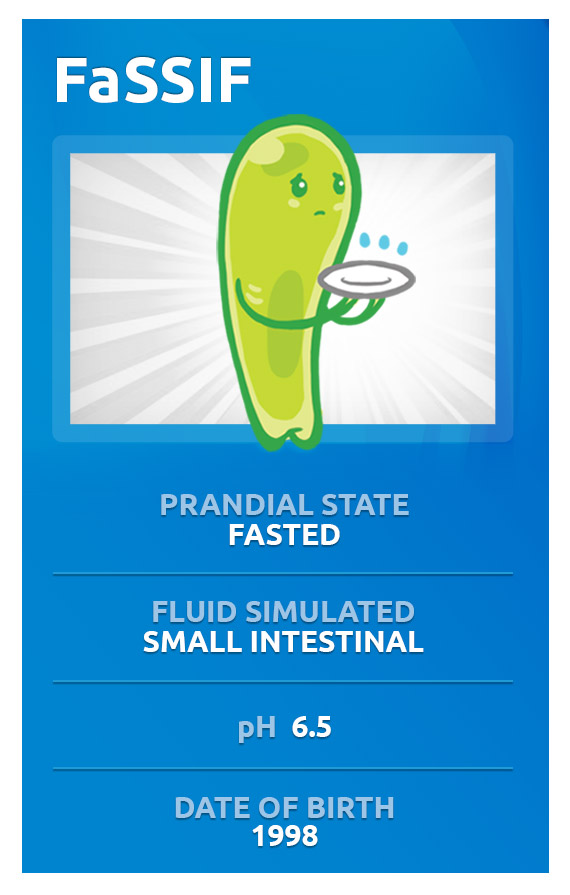 FaSSIF (Fasted State Simulated Intestinal Fluid) is a very useful drug development tool. Tests in this dissolution medium can reveal how your oral drug is likely to dissolve and potentially be absorbed in fluid from the upper intestine after drinking a glass of water.