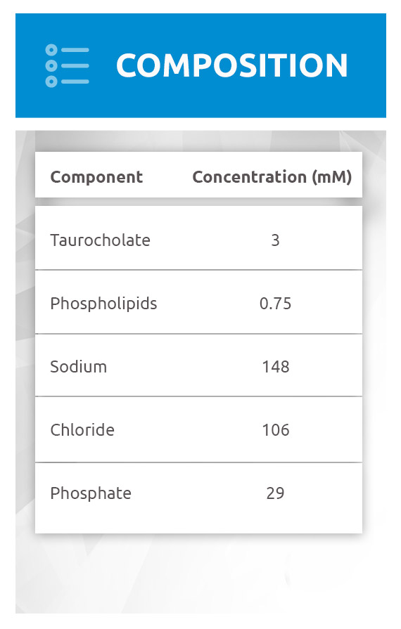 FaSSIF contains the same type and level of surfactants (bile salt and phospholipid) present in the gastrointestinal fluid it replicates. These surfactants are critical, particularly for poorly water-soluble drugs, because they form mixed micelles which can enhance drug solubility and dissolution greatly. This can have a big influence on how a drug is absorbed. FaSSIF has the average pH of fasted intestinal fluid and similar osmolarity (about 270 mOsmol/L) too. These are important parameters to control when testing drugs or formulations sensitive to pH and salt content.