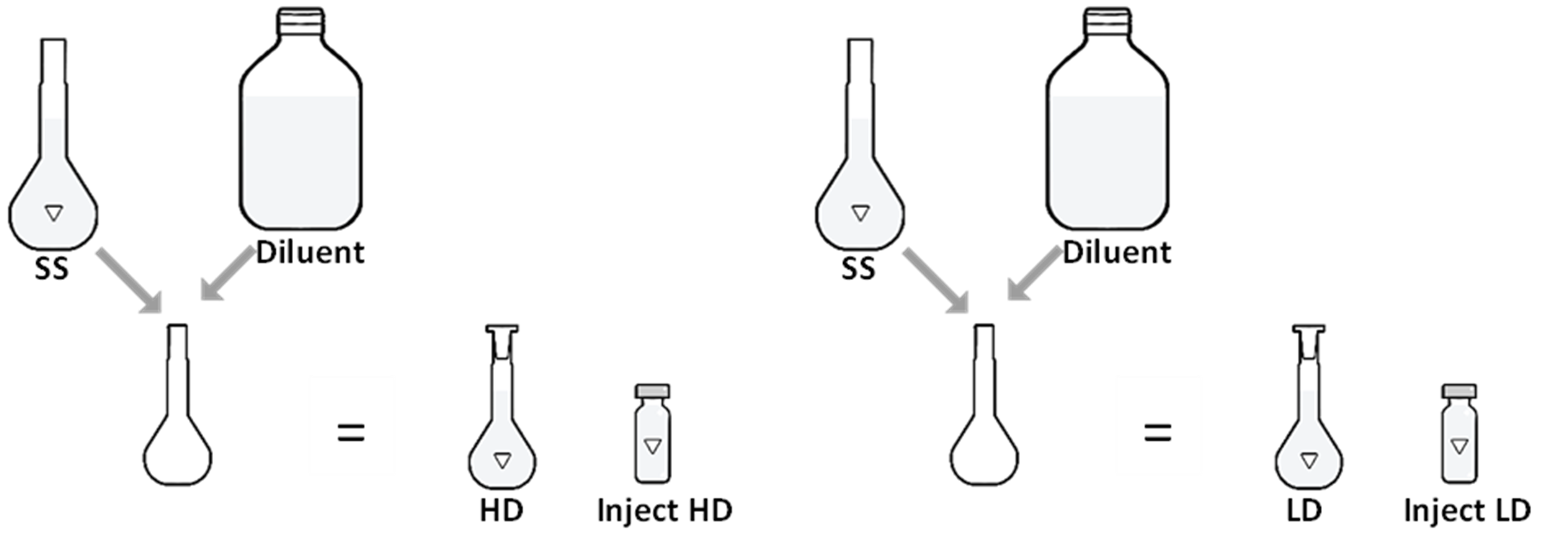 The highest and lowest drug concentration standards are used to check whether the analytical HPLC method can accurately and reliably quantify the drug at both extremes of concentration. For the preparation of HD and LD, dilution of secondary standard is carried out.
