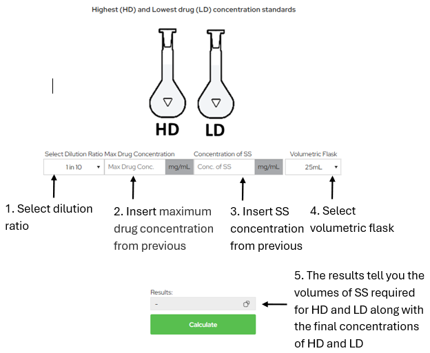Use Highest (HD) and Lowest drug (LD) concentration standards calculator to find out how much volume of secondary standard is required to prepare the HD and LD also what will be the concentration of HD and LD standards.