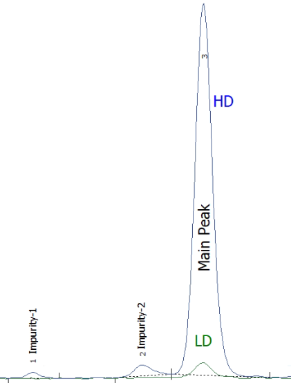The HD is used to determine if any impurity peak is interfering with the main standard peak as higher concentration make such interferences easier to detect as can be seen in figure below. Additionally, peak tailing and drug-column affinity can also be assessed by using the HD standard.
