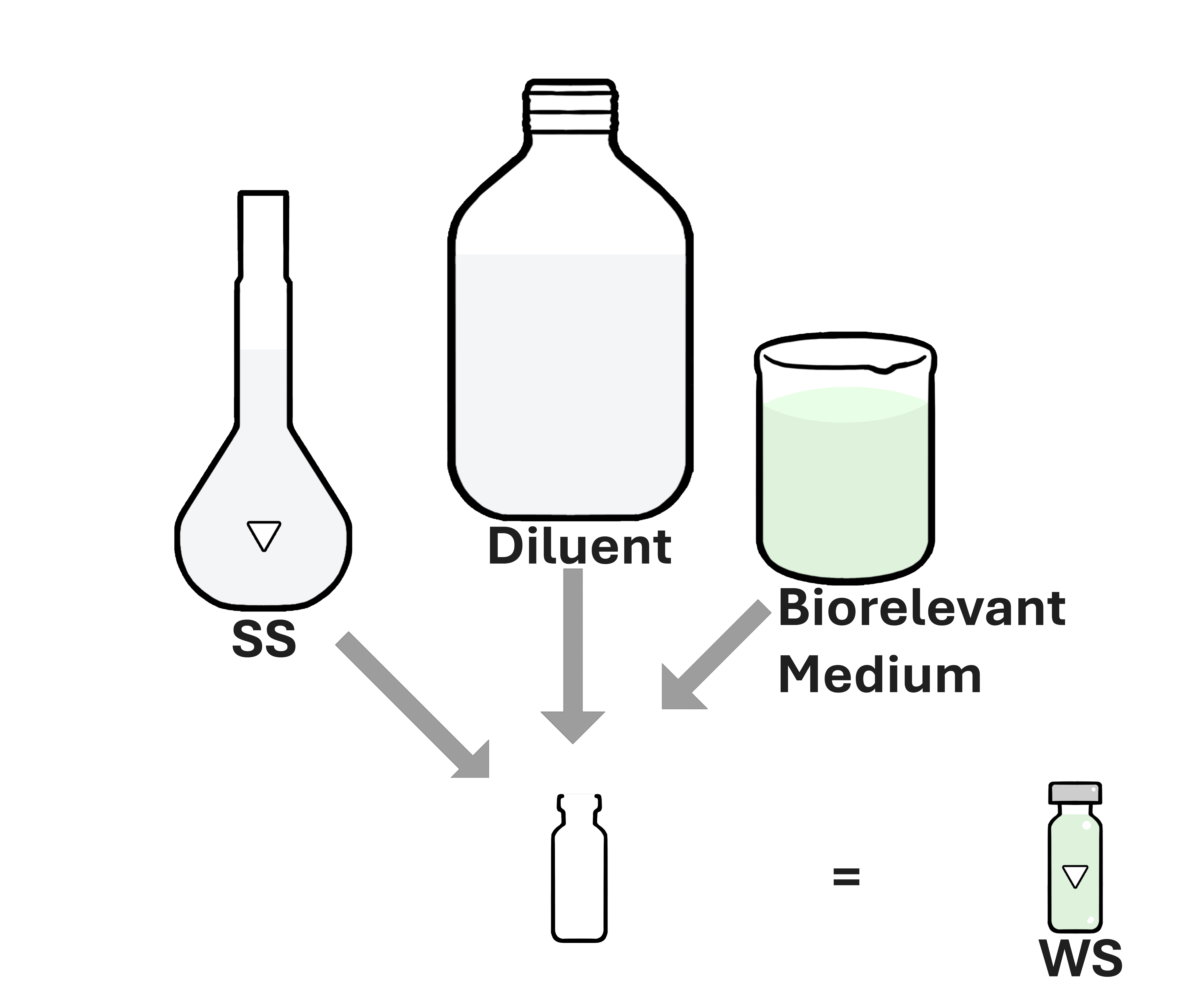 The dilution of standard containing biorelevant medium is slightly different from the biorelevant dissolution sample: a working standard (WS) is typically prepared by combining the SS, diluent and, biorelevant medium together. To prepare a 1:10 dilution ratio, combine 0.100mL of SS, 0.800mL of diluent and, 0.100mL of biorelevant medium, so the final volume will be 1.000mL. The total mL of diluent in 1.000mL will be 0.900mL as the SS is also included in the dilution.