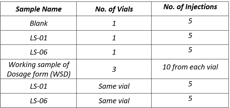 For specificity and precision tests, it is recommended to carry out a similar number of injections that cover the number of samples that will be analysed by HPLC in a typical biorelevant dissolution run. For biorelevant testing of a single drug product in one medium (n = 6 vessels) this usually equates to around 50 to 60 injections.